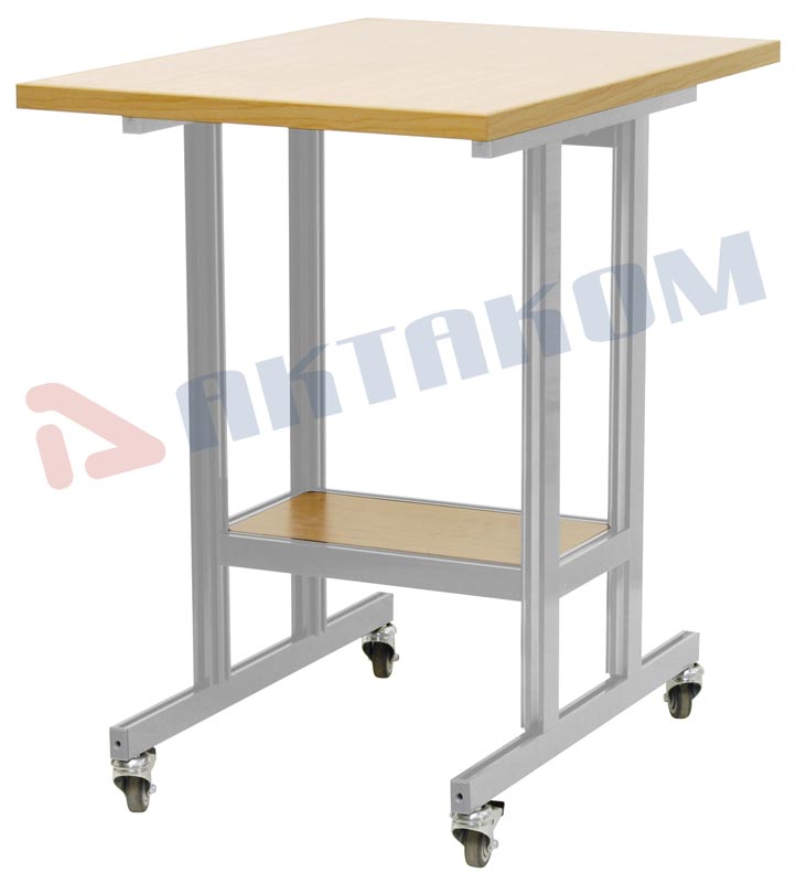 Стол подкатной 50х72,3х75 см. Цвет алюминиевого каркаса - коричневый (RAL-8017), цвет ДСП - белый. Четыре колеса, два из них блокируемые. Полка 40х24 см.
