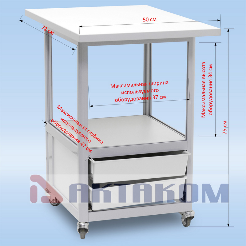 Стол подкатной АКТАКОМ АРМ-5071 с двумя ящиками и полкой над ними является практичным дополнением к рабочим столам АКТАКОМ серии АРМ-4ххх. Высота столешницы идеально совпадает с высотой стола и, таким образом, подкатной стол АРМ-5071 удобно использовать как продолжение поверхности рабочего стола. В таком применении удобно устанавливать на подкатной стол ремонтируемое оборудование (приборы) и перемещать его между различными рабочими столами серии АРМ-4ххх.